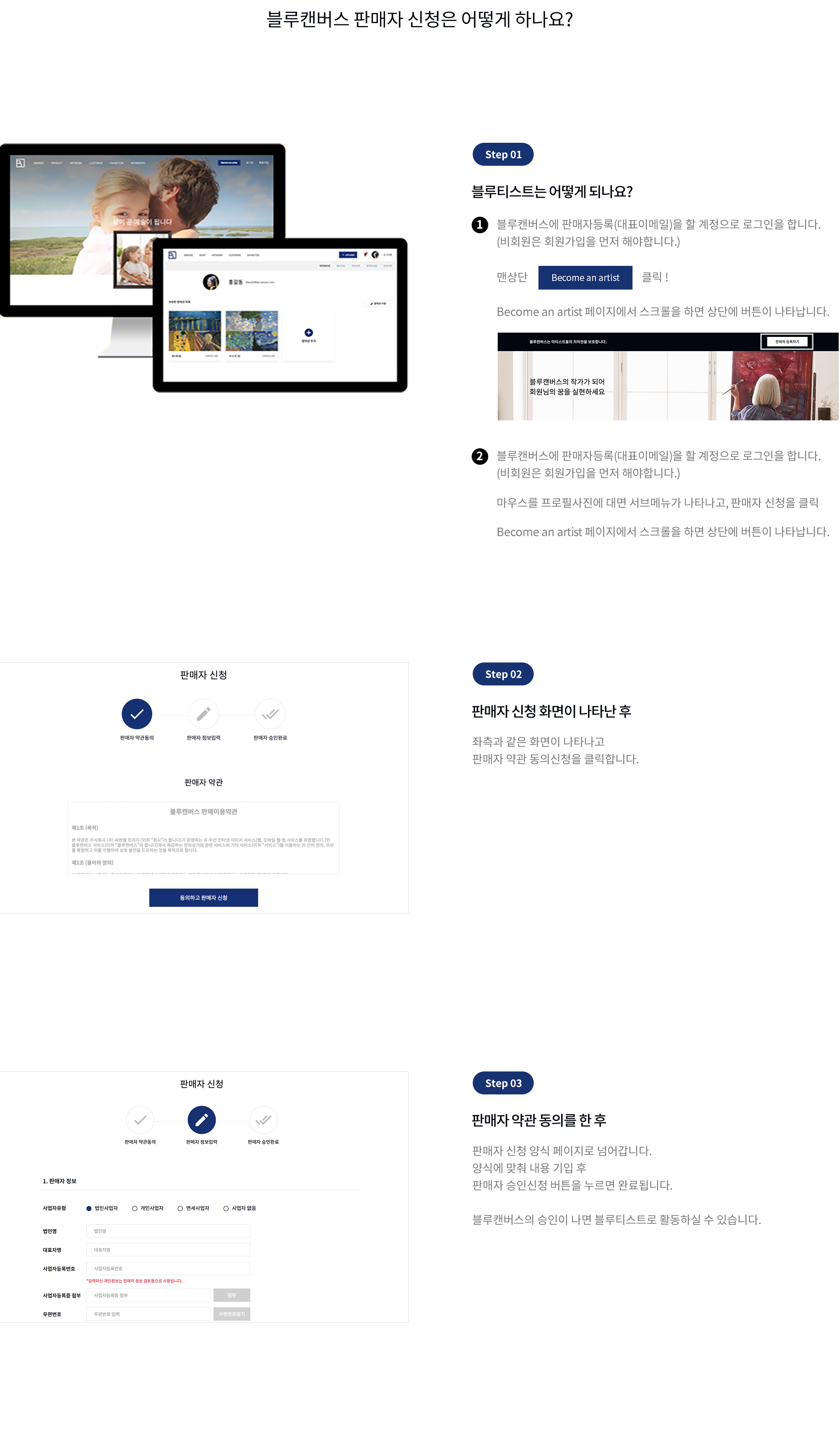 블루캔버스 작품 판매 방법 1. 판매자로 등록 판매자 정보를 입력하면7일 이내에 블루캔버스의 내부심사 기준에 따라 등록여부가 결정됩니다. 2. 작품등록 및 판매 작품의 판매 유형, 가격, 수량 모두판매자가 전적으로 결정합니다. 3. 정산 및 수수료 지급 작품 판매 수수료를 제외한판매금액이 매월 지정된 날짜에판매자가 등록한 은행계좌로 입금됩니다.